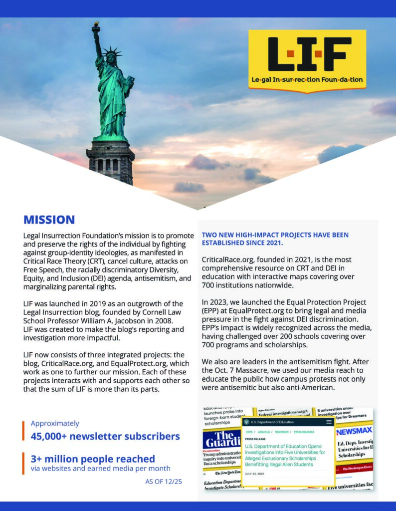 LIF, founded by Cornell Law School professor William A. Jacobson, is one of the leading national free speech and free expression investigative and media organizations. We research and report on some of the most important issues facing our country on school campuses, universities, businesses, and government. We also walk alongside individuals who are at the epicenter of free speech attacks, shining light on attempts to cancel dissidents.