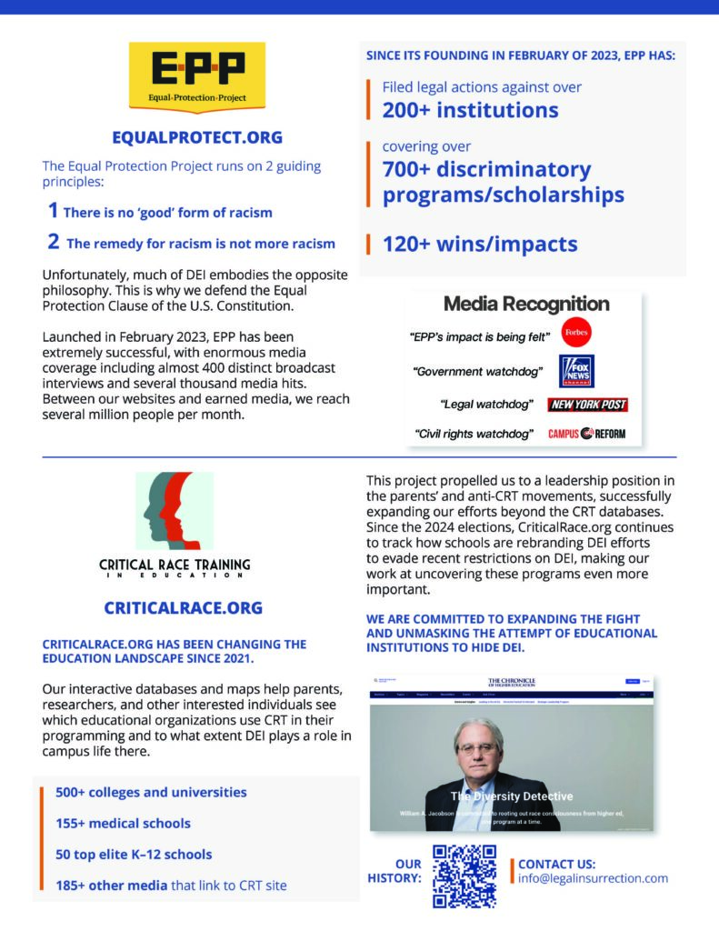 Our most recent project is The Equal Protection Project (EPP)(EqualProtect.org), which opposes discrimination done in the name of Diversity, Equity, and Inclusion. EPP is devoted to the fair treatment of all persons without regard to race or ethnicity. Our guiding principle is that there is no ‘good’ form of racism. The remedy for racism never is more racism. At EPP we will investigate wrongdoing, educate the public about it, and litigate when necessary to stop bad conduct.